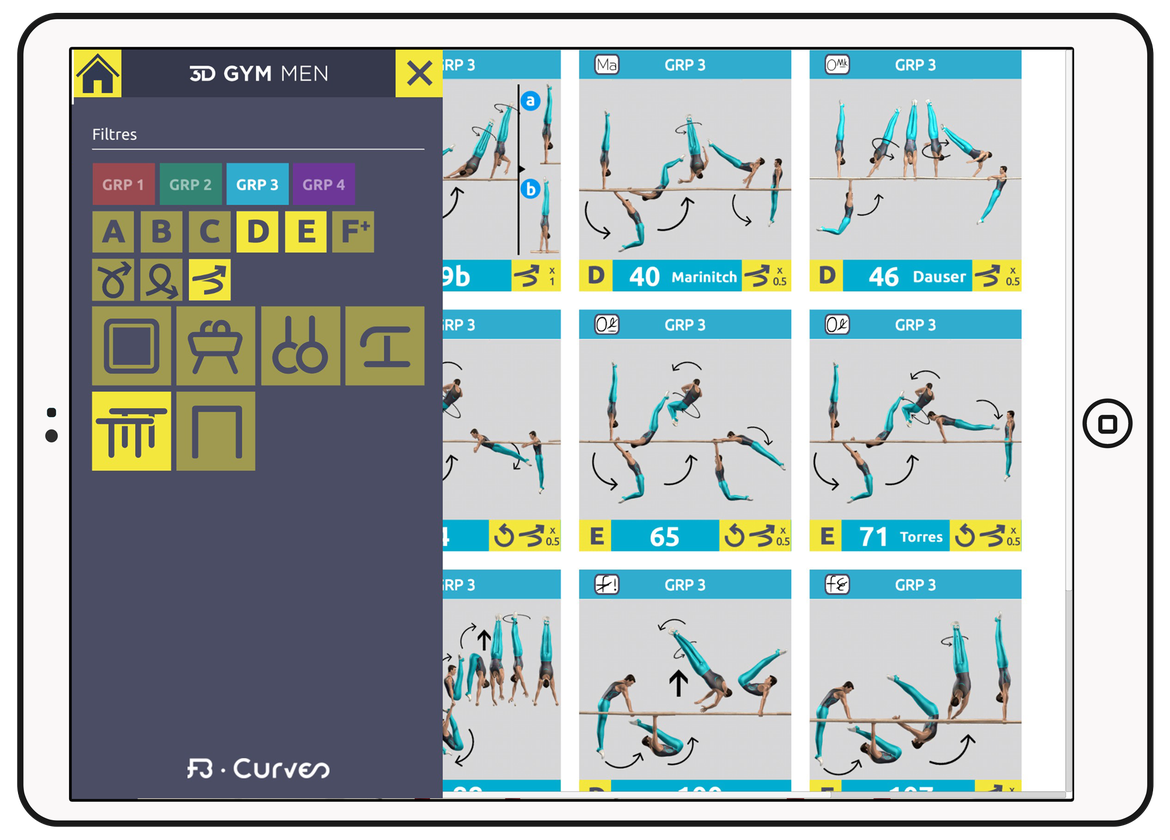 The App has a powerfull search engine built in to facilitate your search for skills. You can also search with the name of the element or just freely browse all of our 3D videos. A great tool to help with routine construction or to generate ideas for skills needed to complete routine requirements within a certain category.